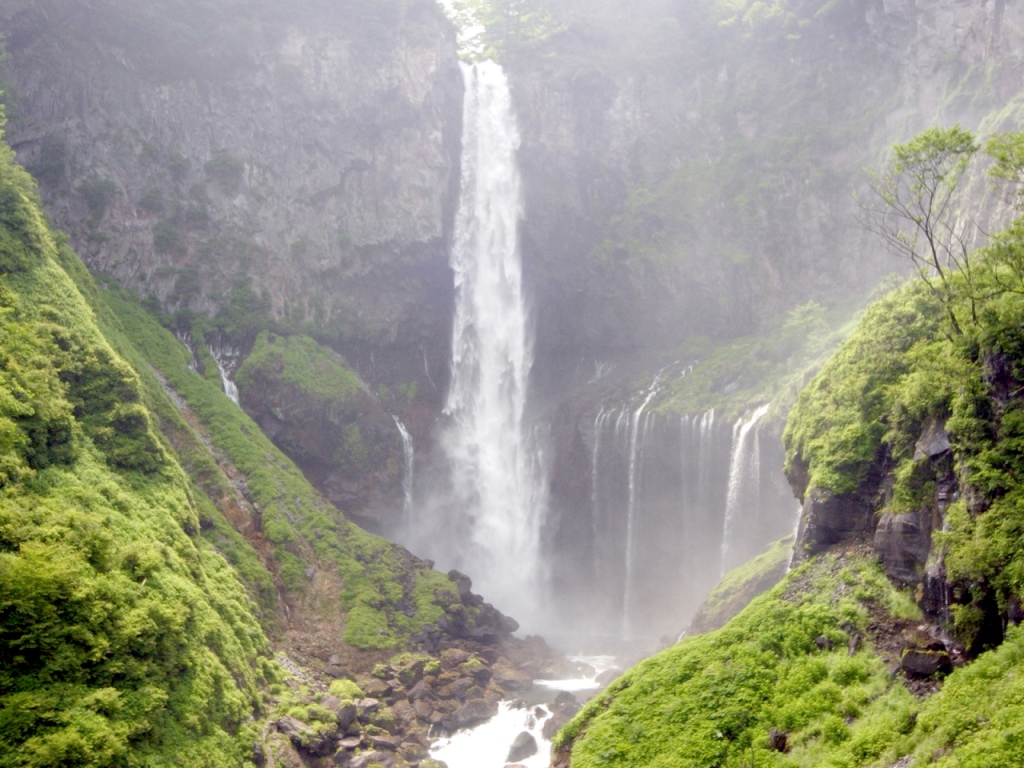 高さ97m。中禅寺湖から流れ出る大尻川が大岩壁から一気に落下し、「日本三名瀑」の一つに数えられる豪壮な瀑布を形成している。
