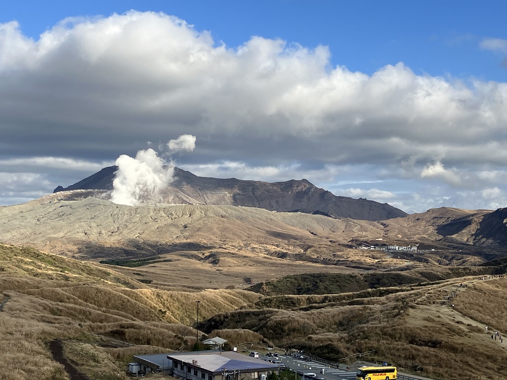 九州の中央部に位置する複式火山*で、世界的に有名な活火山。阿蘇山という単体の山はなく、東西約18km、南北約25km、面積約350km2の世界最大級規模のカルデラ*の中央に並ぶ阿蘇五岳*を中心とした中央火口丘群の総称を阿蘇山と呼ぶ。広い意味では、外輪山や火口原も含めて阿蘇山と呼ぶ。